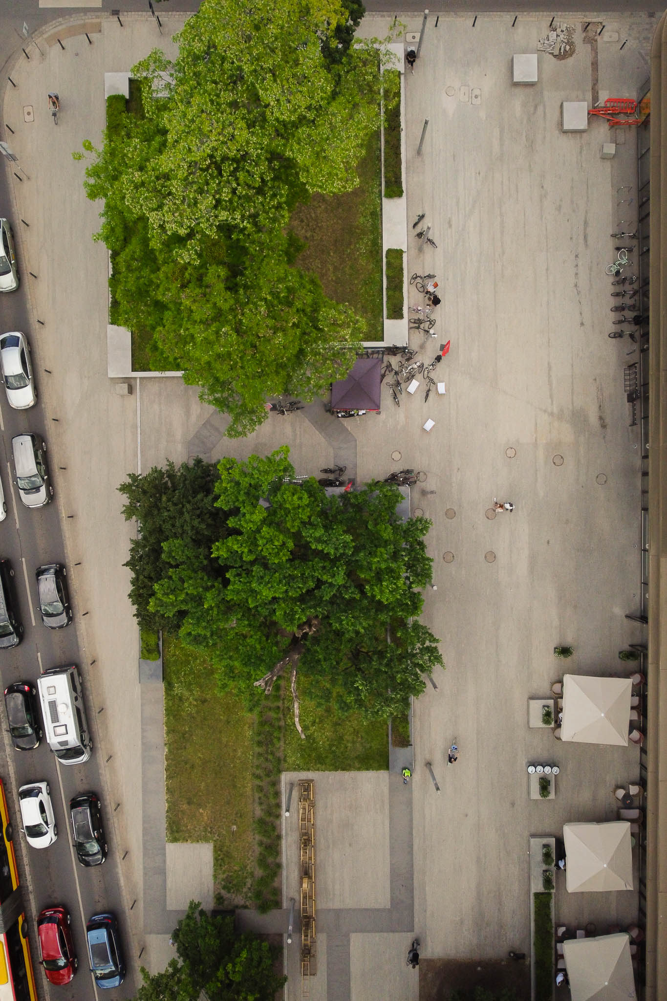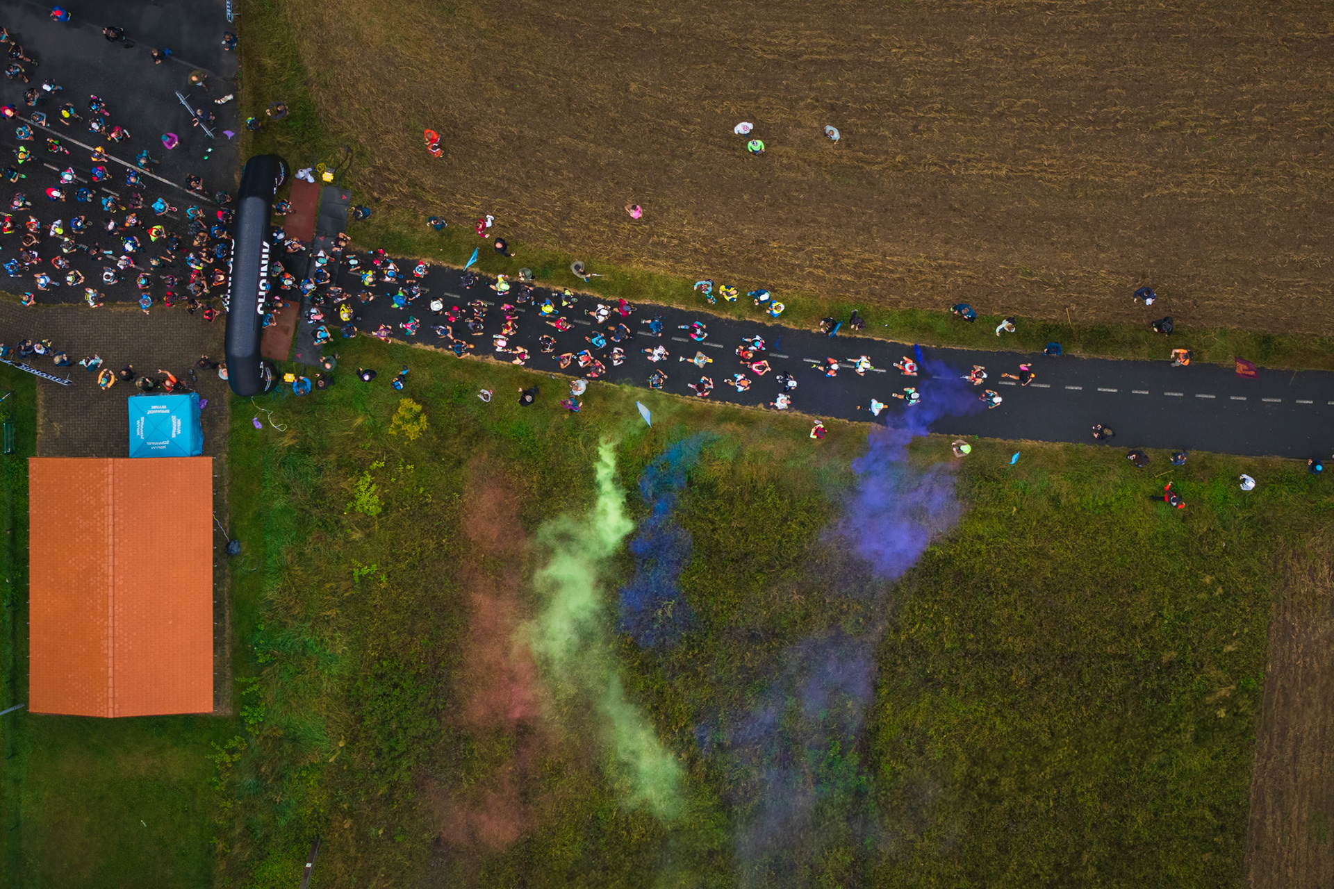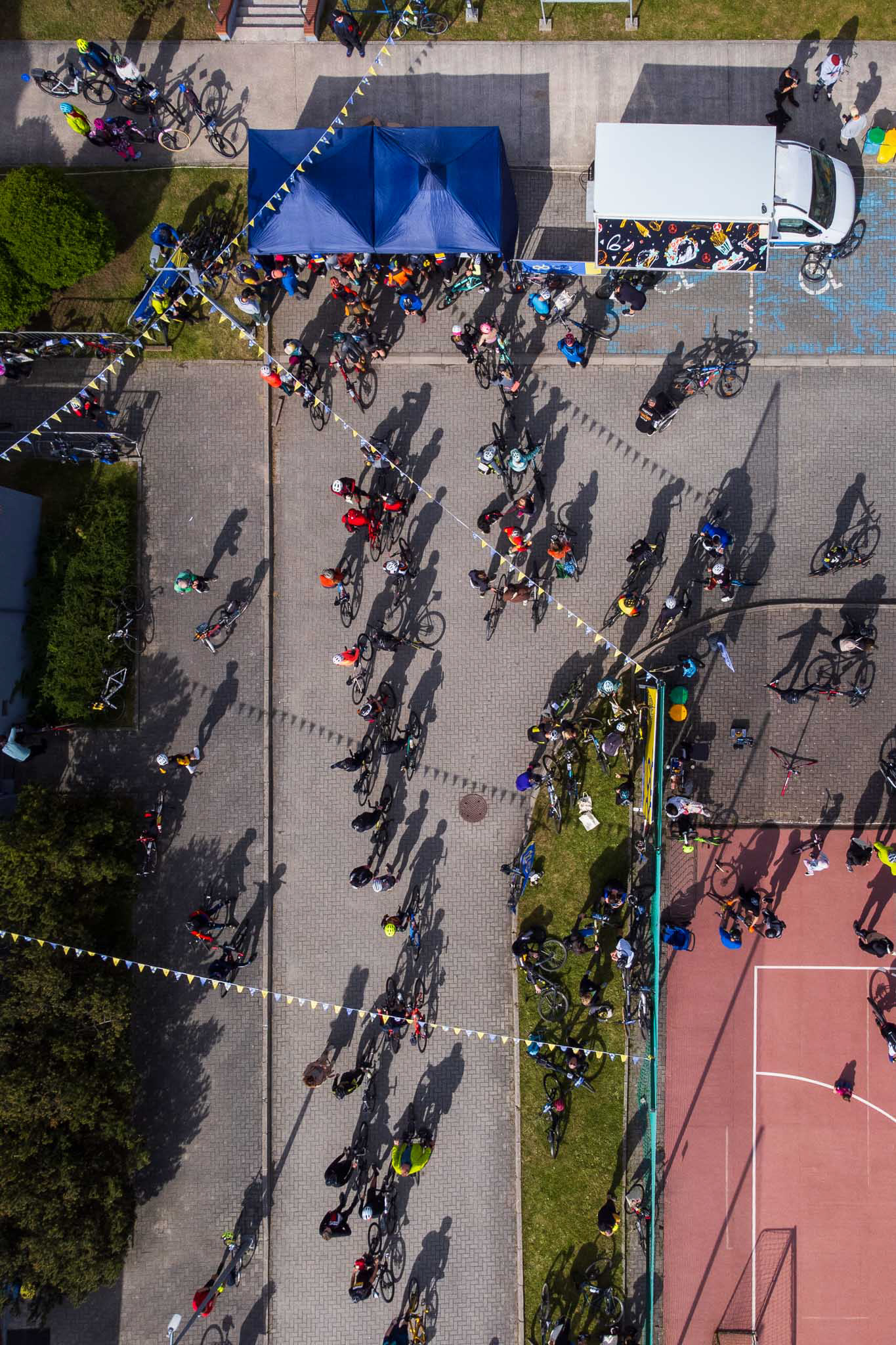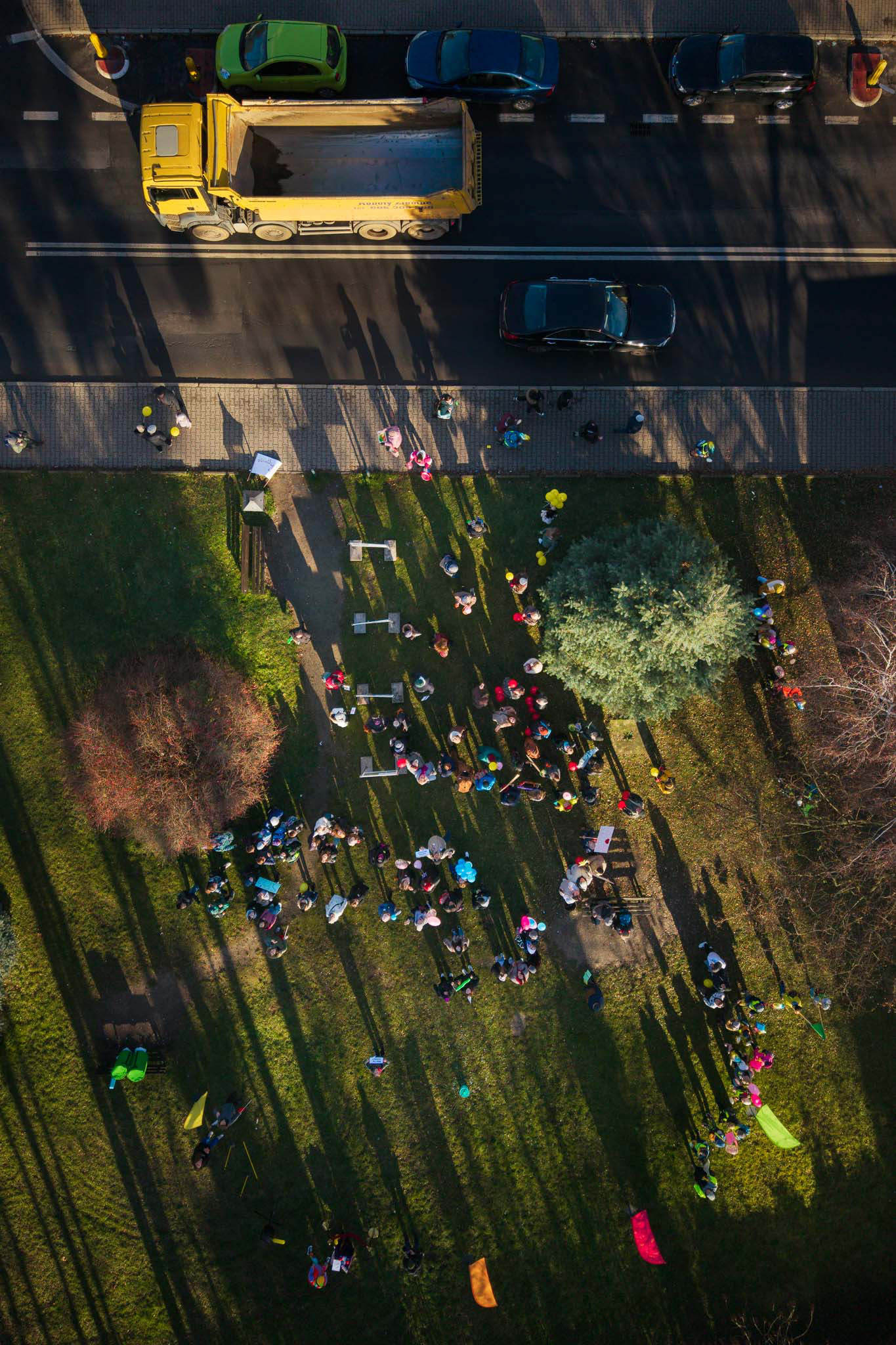 Perspektywa, której nie widać z poziomu ulicy. Ujęcia z drona pozwalają pokazać skalę, układ przestrzeni i relacje między elementami. Takie zdjęcia są doskonałym uzupełnieniem reportażu eventowego, fotografii architektury czy relacji z wydarzeń sportowych.